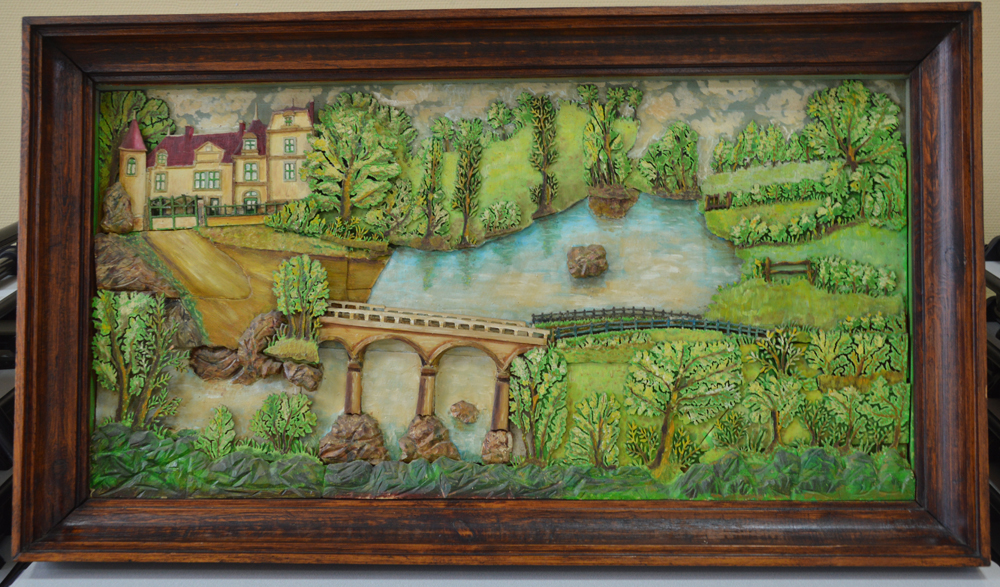 En même temps une exposition de tableaux en relief: Ces tableaux ont la particularité d’être en relief grâce au découpage de petites pièces de bois, représentant soit un personnage, soit un arbre, un pont….